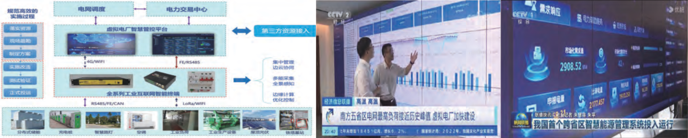 虚拟电厂是解决双碳问题有效的市场化手段,通过负荷聚合、区块链等关键技术实现聚合不同品类的可调控资源,可盈利的参与电网辅助服务。虚拟电厂运行管理平台负责联系调度中心、协调市场主体,充分挖掘资源调控潜力,依托现有统一电力市场交易平台,实现从虚拟电厂注册管理、运行监视、响应能力感知、资源调度、交易过程管理、结算管理、效能评价、合同管理的全流程虚拟电厂交易功能。南方电网虚拟电厂作为目前国内规模最大的虚拟电厂已接入广东、广西等省市多种响应资源,注册容量12390MW,可调节容量2410MW,2022年已累计调节 1910MW。2023年7月5日,央视新闻联播报道,我国首个跨省区智慧能源管理系统南方电网分布式源荷聚合服务平台正式投入运行,实现需求响应、二次调频等的业务功能。