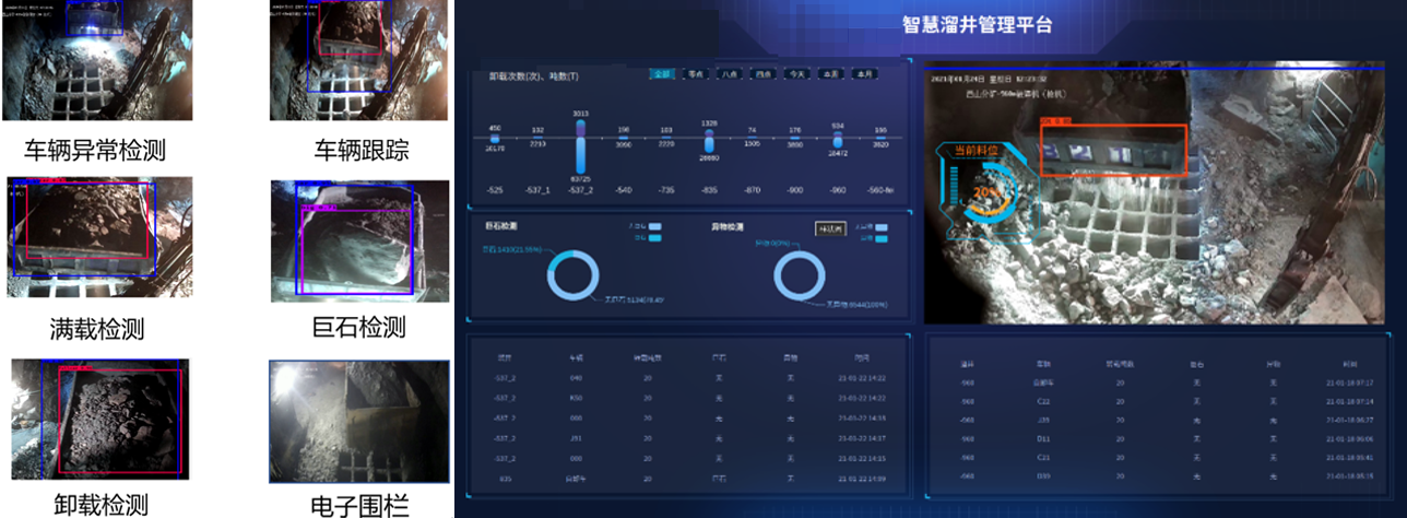 形成以大数据采集、预处理、分析与可视化为核心部件的系统架构,以数据标准化、数据分析模型库和数据可视化为核心的功能模块,展示每个溜井运行数据、矿车出入料数据、溜井料位数据、车队管理调度数据等日常运行数据,保证矿石运行数据的全面性、可靠性和系统性。